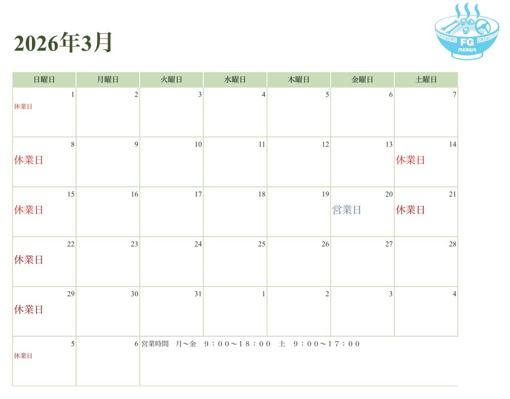 2026年3月営業日カレンダー